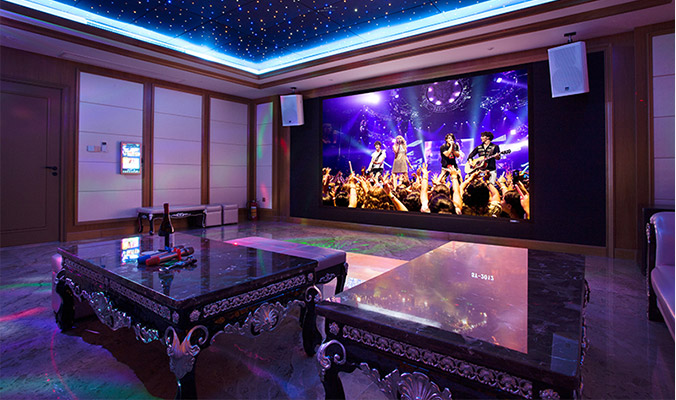 項目位于別墅地下層,面積43平方米,業(yè)主需求為7.3.4Dolby Atmos全景聲影院加專業(yè)卡拉OK娛樂系統(tǒng)。