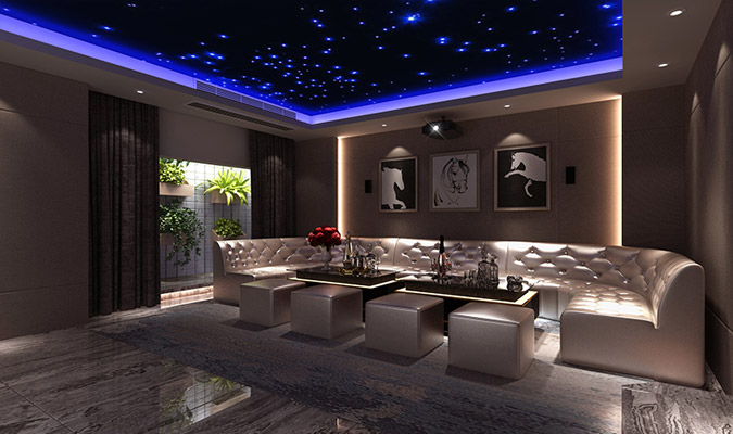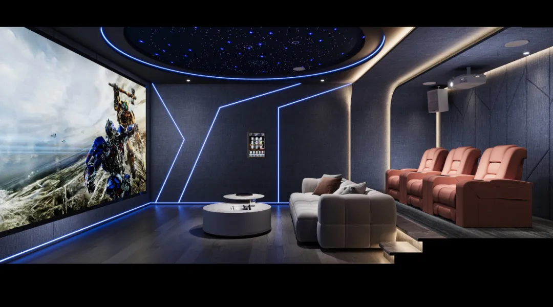 CAV 7.2.4杜比全景聲影院系統(tǒng)+4.1專業(yè)卡拉OK系統(tǒng),集影院、卡拉OK功能為一體的多功能影音室;喜歡藍色,希望影音室的色調(diào)能夠有藍色的元素,整體風格希望簡單又大氣。
